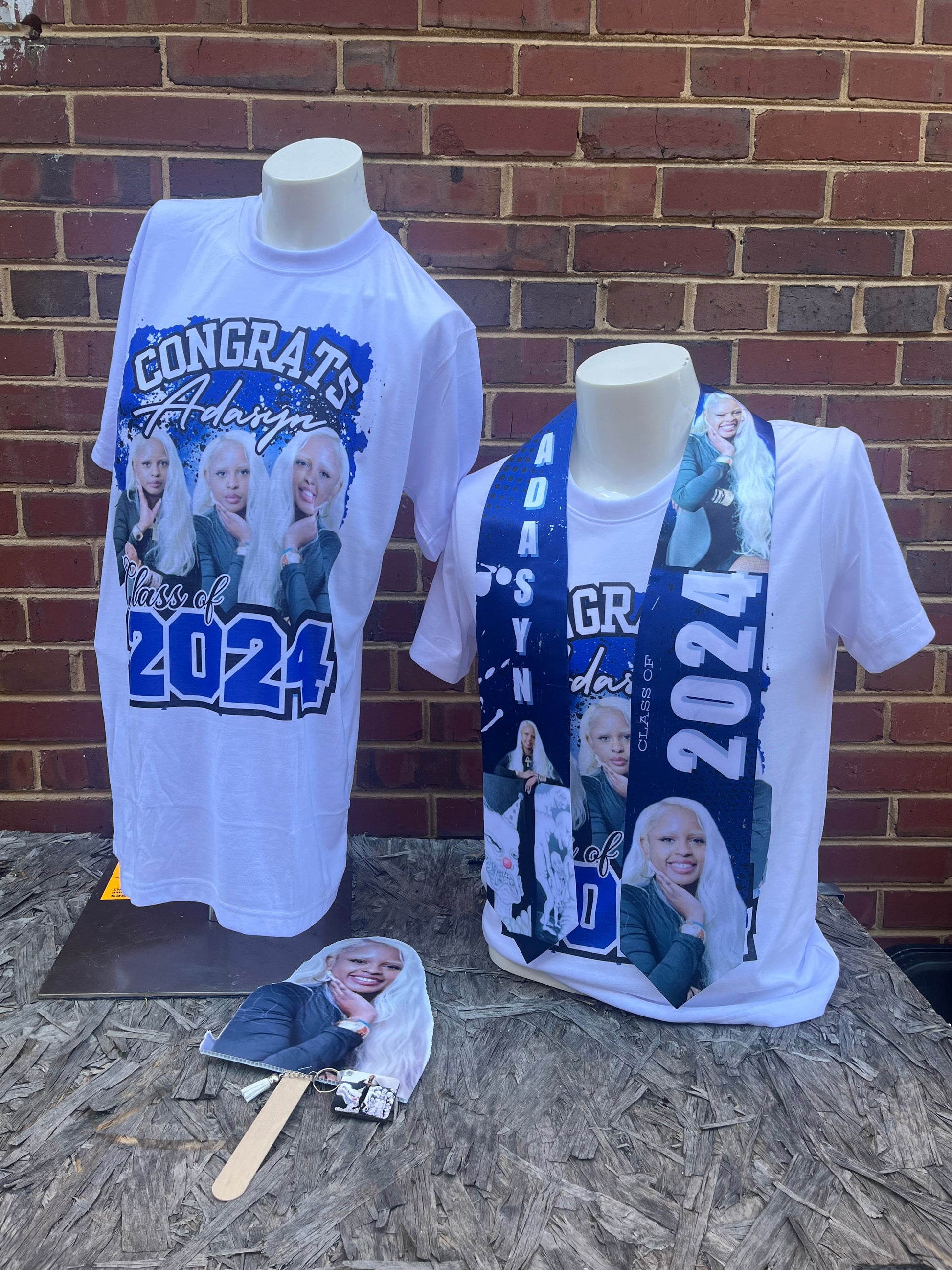 This package includes 5 custom Large size Printed Shirts, 1 Keychain, 1 Grad Stole, 10 Buttons, and 10 Fans